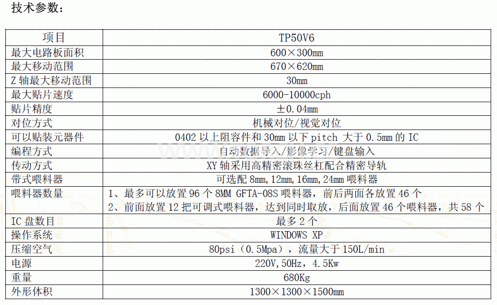 高速貼片機(jī)TP50V6是一款全自動(dòng)視覺貼片機(jī),它通過真空吸嘴可以貼裝各種元件,是目前市場(chǎng)上性價(jià)比高的全自動(dòng)貼片設(shè)備。本產(chǎn)品適合大部份SMD 片狀元件0402, SOIC, PLCC 及QFPIC;配置視覺對(duì)中系統(tǒng),滿足高精密度0.5mm 腳距之QFP IC 或BGA 等芯片的貼裝.除標(biāo)準(zhǔn)的圓形基準(zhǔn)點(diǎn)外,不絲印焊錫膏的方形的PCB 焊盤和環(huán)型穿孔焊盤,也可作為基準(zhǔn)點(diǎn)來識(shí)。