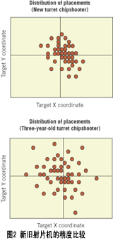 轉(zhuǎn)盤式射片機(jī)經(jīng)過較長時(shí)間的使用,由于零部件開始磨損,也會(huì)出現(xiàn)元器件拾取和貼裝精度問題。由于絲杠和凸輪表面開始磨合(或磨損),X-Y工作臺(tái)、轉(zhuǎn)盤貼裝頭、θ旋轉(zhuǎn)、帶盤絲杠之間的公差關(guān)系,基準(zhǔn)識(shí)別能力等等這些影響精度的因素相疊加,使得目標(biāo)貼裝或拾取點(diǎn)出現(xiàn)偏差。結(jié)果拾取和貼裝精度惡化(圖2)。這對(duì)于大的元器件可能不是什么問題,但當(dāng)貼裝0402、0201甚至01005無源元件時(shí),它們就會(huì)帶來麻煩。