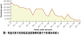 轉(zhuǎn)盤式射片機(jī)存在的固有問題,與以機(jī)器設(shè)計(jì)基本原理為基礎(chǔ)的速度和精度有關(guān)。隨著器件尺寸的變化,轉(zhuǎn)盤速度進(jìn)而貼裝率必須改變,以便與不同元器件和喂料器的結(jié)構(gòu)相適應(yīng)。盡管圖1看上去令人費(fèi)解,實(shí)際情況可能還要糟糕。圖中表示出的一個(gè)使人迷惑的事實(shí)是,如果在轉(zhuǎn)盤上出現(xiàn)一個(gè)大的元器件,所有其它元器件的貼裝速度也必須慢下來;否則,貼裝的可靠性就會(huì)受到影響。實(shí)質(zhì)上,轉(zhuǎn)盤上的其他元器件都受最慢的元器件的處理速度控制。這種情況由于在大間隙機(jī)械傳動(dòng)的帶盤喂料器上要求的多檢索作業(yè)而進(jìn)一步加劇,如圖1中凹陷的低谷部位所示。記住以下這點(diǎn)也很重要,傳統(tǒng)射片機(jī)主要受帶盤或散裝元器件供料的限制,這是柔性貼裝的關(guān)鍵影響因素。
