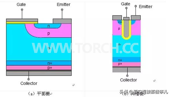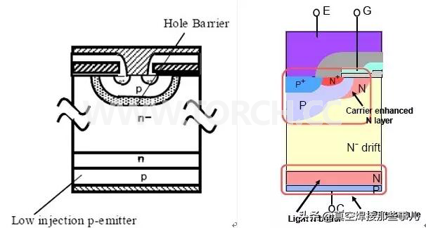 IGBT的集電極區結構影響著PNP晶體管的增益,對正向壓降與關斷損耗都有重要的影響。早期的穿通型IGBT其集電極區結深較大,空穴注入效率很大,容易發生閂鎖效應,必須采用局部壽命控制技術來控制背部空穴注入效率,但是卻因此面導致了導通壓降的負溫度系數,不利于并聯應用。后來出現的非穿通型IGBT,采用了透明集電極結構,