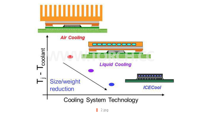 傳統(tǒng)的空調(diào)冷卻方式使用冷空氣和散熱片(頂部),經(jīng)證實(shí)不如溫水冷卻(中央),而DARPA ICECool計(jì)劃開(kāi)發(fā)的技術(shù)承諾可借由使用介電質(zhì)蒸氣(底部),進(jìn)一步縮減尺寸與成本。
